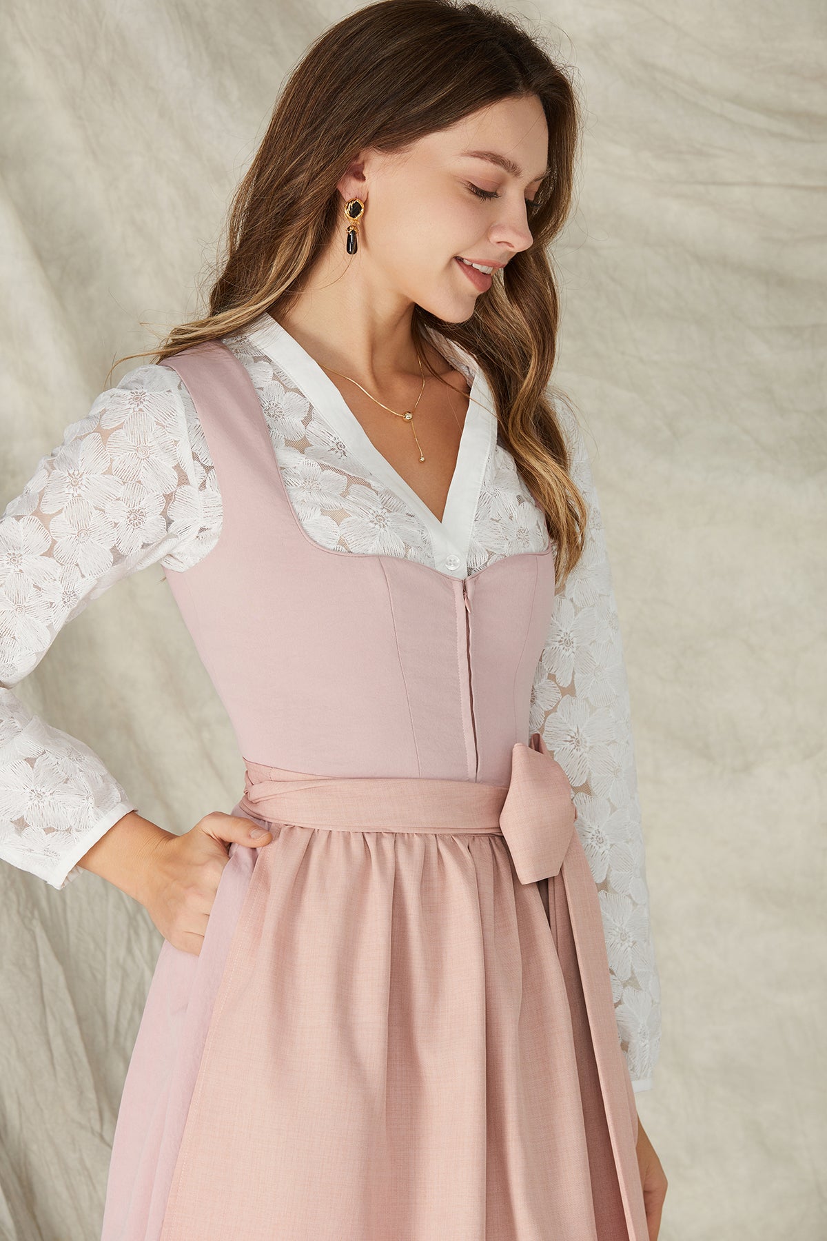 A pink dirndl is the perfect choice for any woman who wants to dress femininely, cheerfully, and festively. Pink is a color that spreads good cheer and is suitable for many occasions. Whether you're going to Oktoberfest, attending a wedding, or simply taking a stroll in the park, you'll always be an eye-catcher in a pink dirndl.